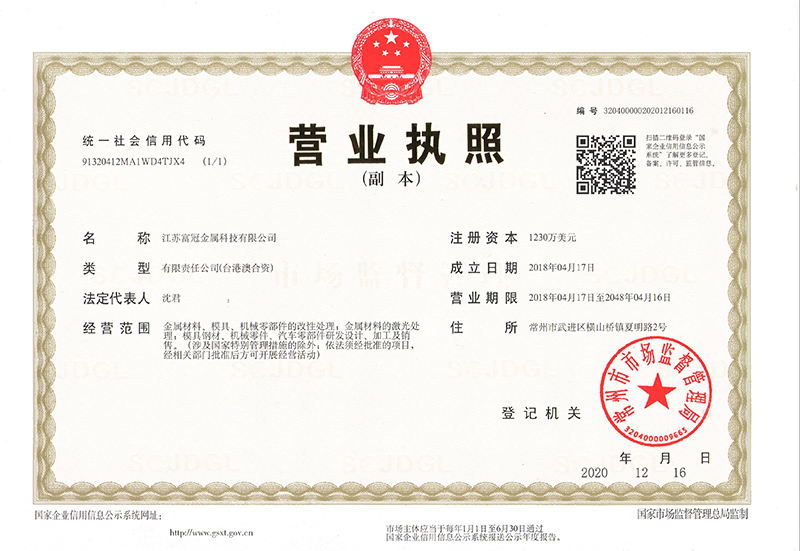 江蘇富冠金屬科技有限公司(以下簡稱:“公司”)成立于2018年4月,隸屬于鑫昌泰集團,是常州市經開區(qū)招商引資的重點外資企業(yè),注冊資本1230萬美元,座落于常州市經開區(qū)橫山橋智能裝備產業(yè)園,占地面積22762.8平方米,員工總數(shù)100人。公司主要經營:金屬材料、模具、機械零部件的改性處理;金屬材料的激光處理;模具鋼材、機械零件、汽車零部件研發(fā)設計、加工及銷售。并具有真空淬火、普通淬火、調質、去應力回......